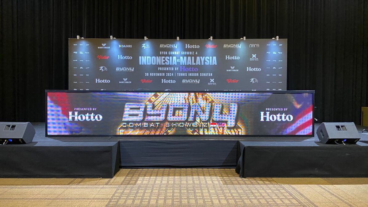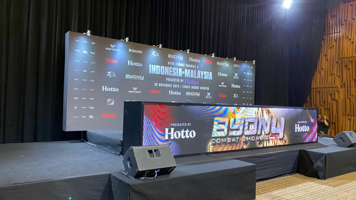 Backdrop di panggung utama BYON COMBAT Tennis Indoor Senayan Jakarta