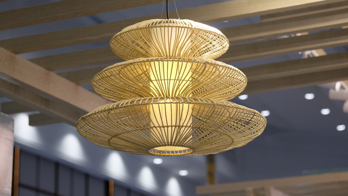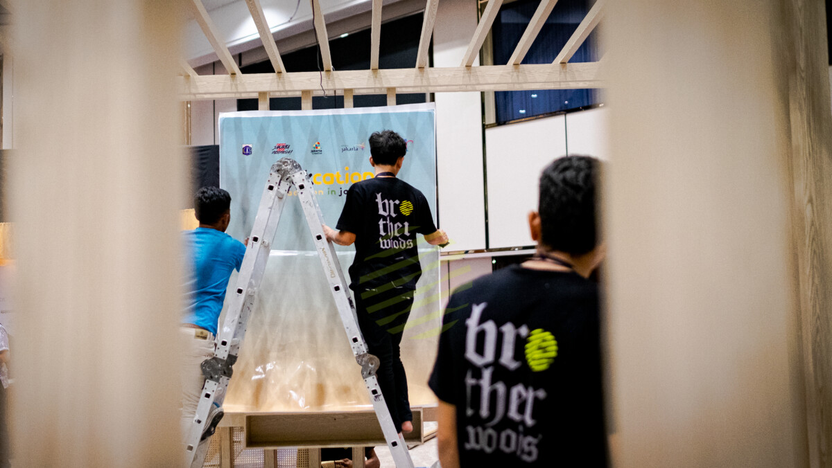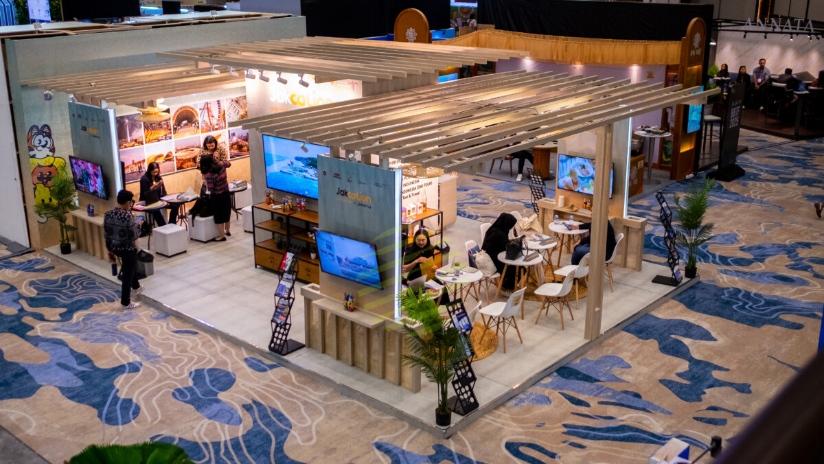 Kustom Booth Untuk DISPAREKRAF konsep kreatif dari bahan kayu unik dan lampu dari rotan , tambahan led strip , tv dan dekorasi meja yang unik.